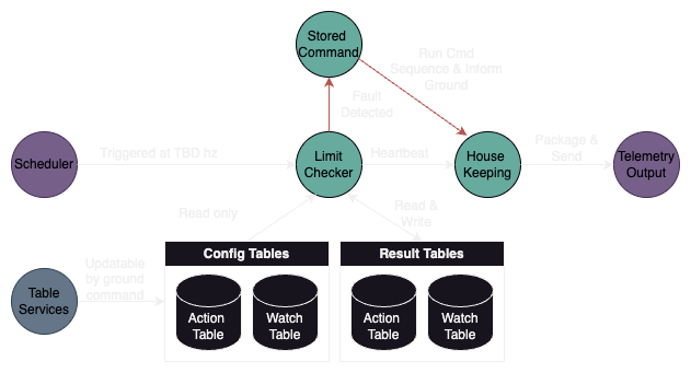 TERP-RAPTOR needs to be able to catch errors and produce warnings of its own when its flying. To achieve this, I primarly utilized the Stored Command and Limit Checker applications that are provided by the opensource cFS distribution on github. The way this system works is quite simple, but extremely efficient. Every TBD ticks, the Limit Checker will check messages on the bus or in queue to see if any limits have been passed or if there are any issues with the values passed on the bus. If an anomalous value is found, the Stored Command app will be triggered to run a command that would help mitigate the issue. The command is preconfigured via the tables associated with the Limit Checker app.