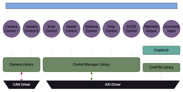 To communicate and manage the hardware the applications make calls through shared libraries that pipe data to and from the hardware managers the exist ont the fabric. Since the majority of the system utilizes AXI register interfaces, the majority of the software simply utilizes the same AXI driver. The cameras which at the moment are communicated with through CAN utilize a seperate driver and library stack. Finally for command & telemetry there is an intermediate library, CryptoLib which is explain in the Command & Data Handling Page.