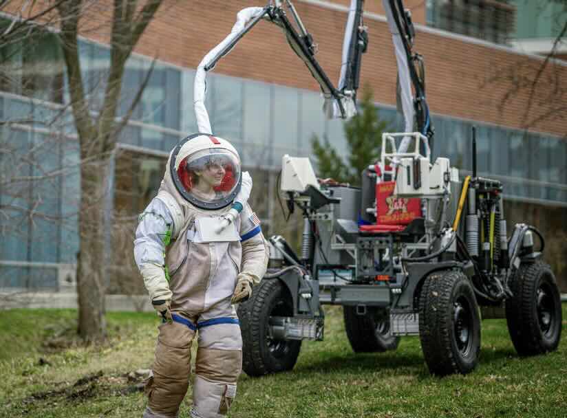 Vertex/Biobot on its maiden field test tailing the astronaut, Meredith Embrey , providing life support via its umbilical during an EVA simulation.