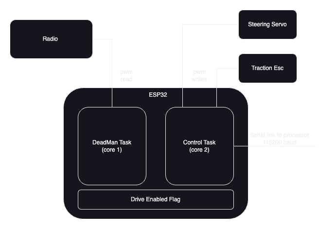 On one of these cores, I have a thread (sequence of executions) that is purely listening to the Pulse Width Modulation (PWM) signals coming from the radio and monitoring the trigger on the remote. This thread will take the value from the radio and set a boolean flag (deadman_triggered) depending on the state of the remote’s trigger.
